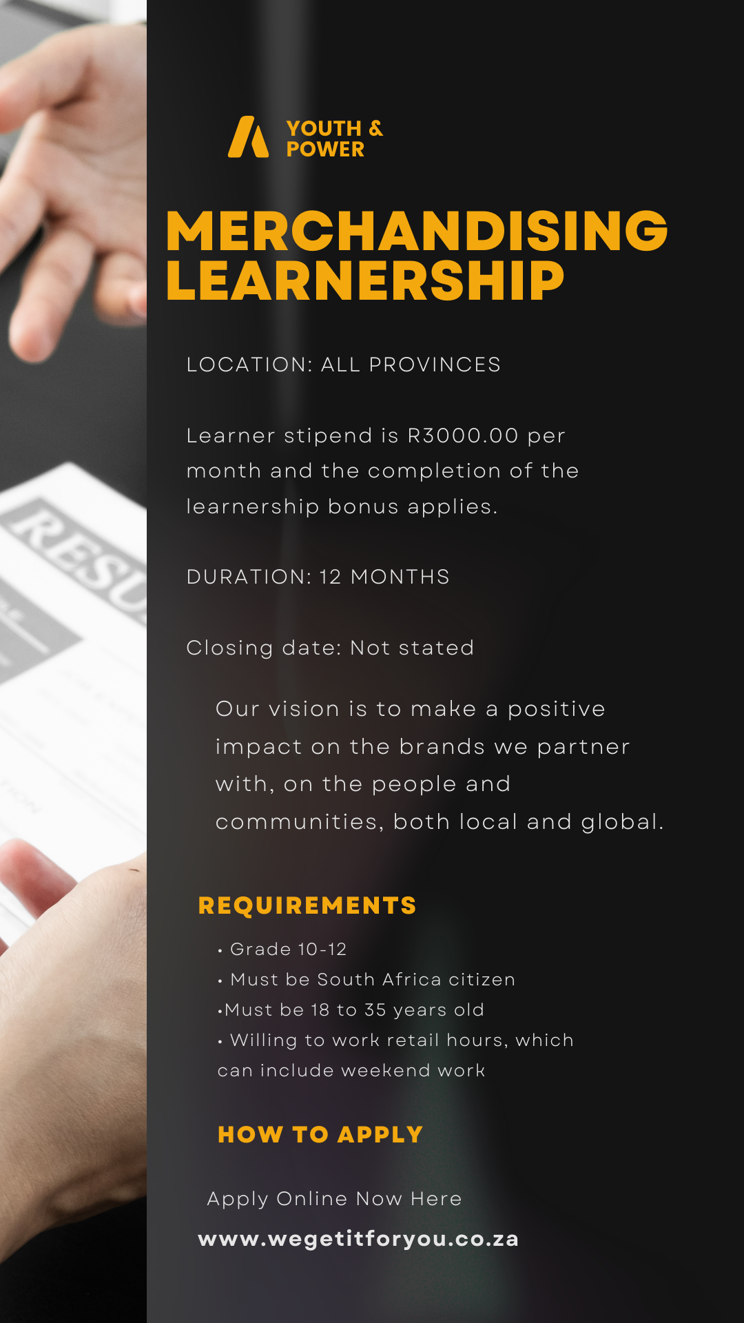 By applying for a learnership, you hereby give consent for your personal information to be retained on our database for current and future learnership opportunities and further give consent for your personal information to be accessed by third parties, strictly for the purposes of learnership placements.